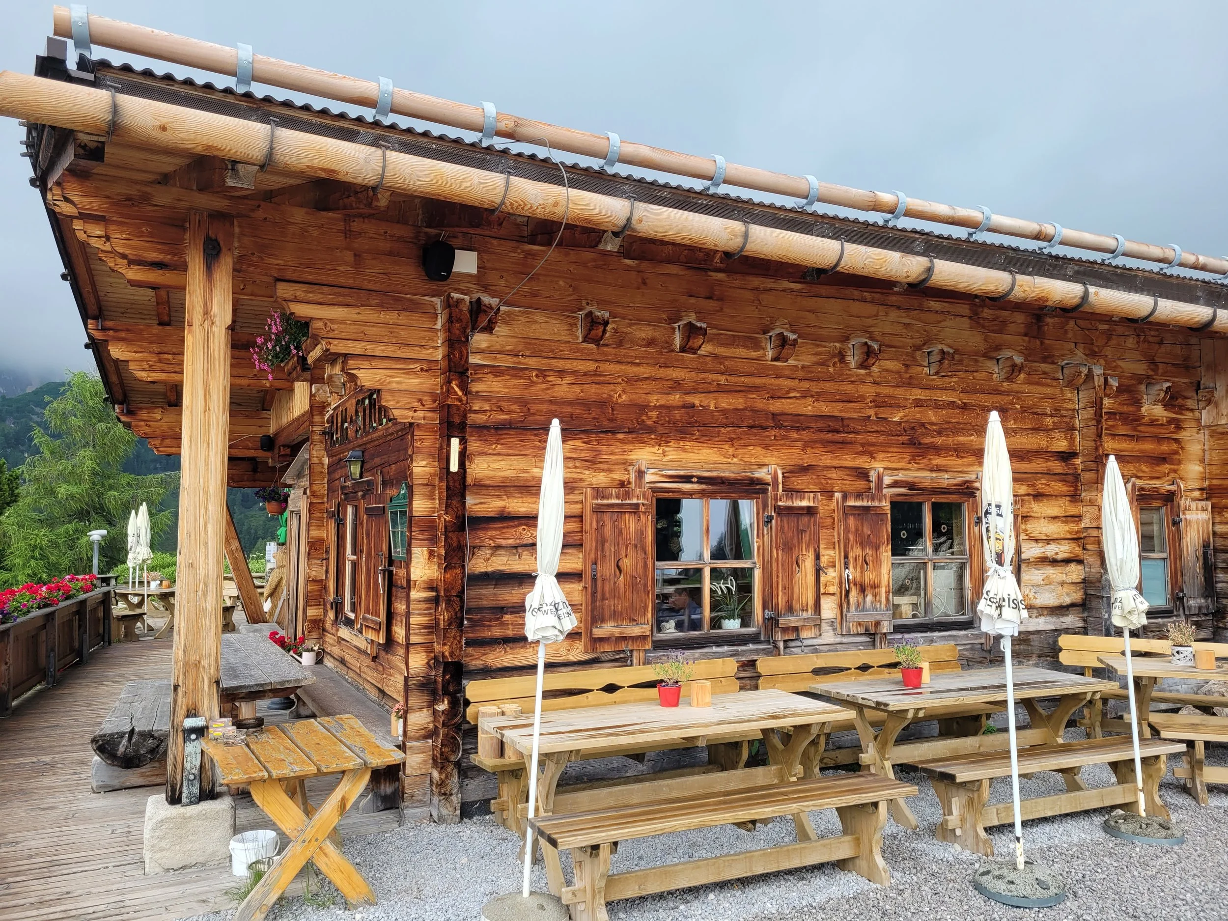 Wir fuhren daher mit der Rofanbahn wieder hinauf auf den Berg, wo wir in einer urigen Hütte Speckbrot und Germknödel bestellen.