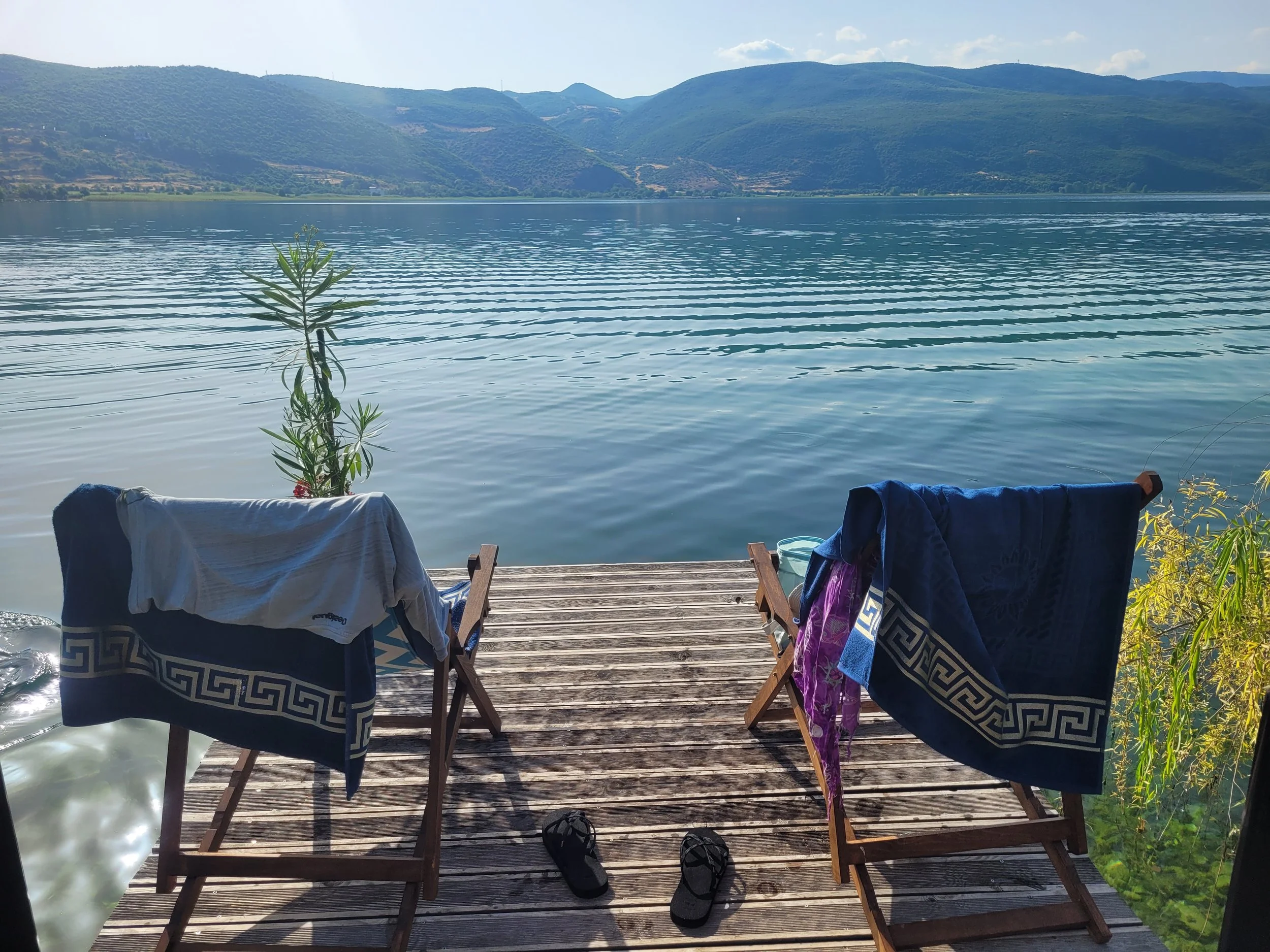 Abends aßen wir leckeren Fisch mit köstlichem Gemüse im Garten des Gästehauses. Dazu genossen wir tiefroten Wein aus Albanien, während die Sonne langsam über den See unterging und für ein prächtiges Farbendspiel sorgte.