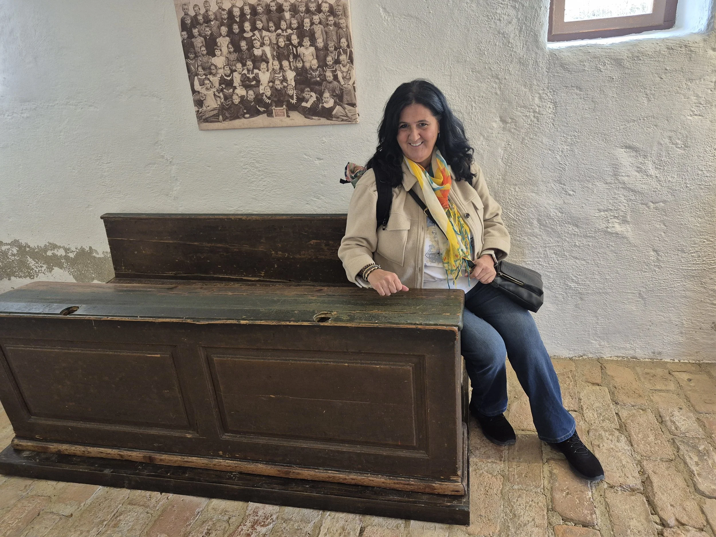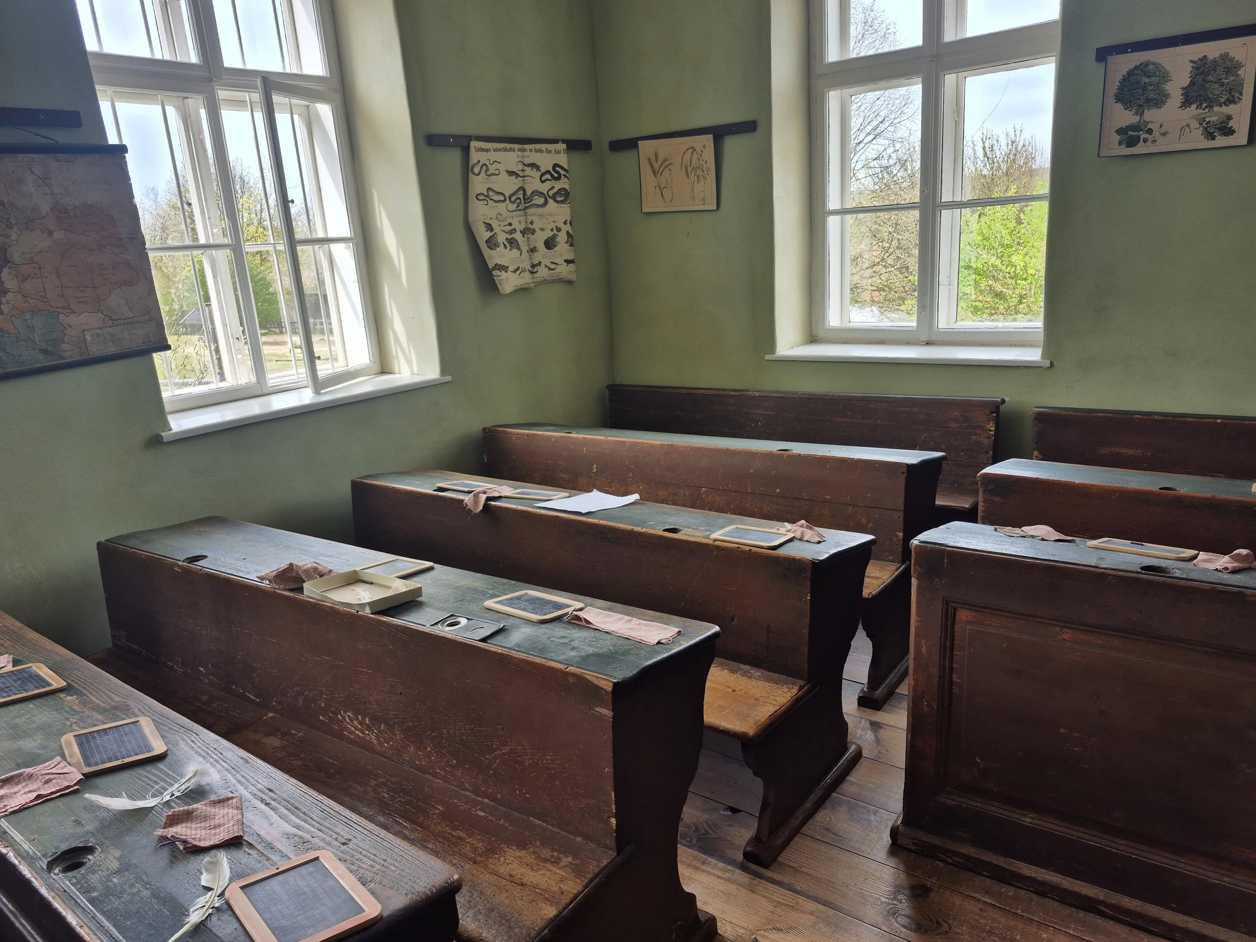 Das erste Gebäude auf dem Weg ist die Dorfschule. Im Vorraum sind alte Schulbücher ausgestellt, dann betritt man das erste Klassenzimmer mit hölzernen Sitzbänken, Schiefertafeln und zahlreichen Kästen, die originales Unterrichtsmaterial enthalten.