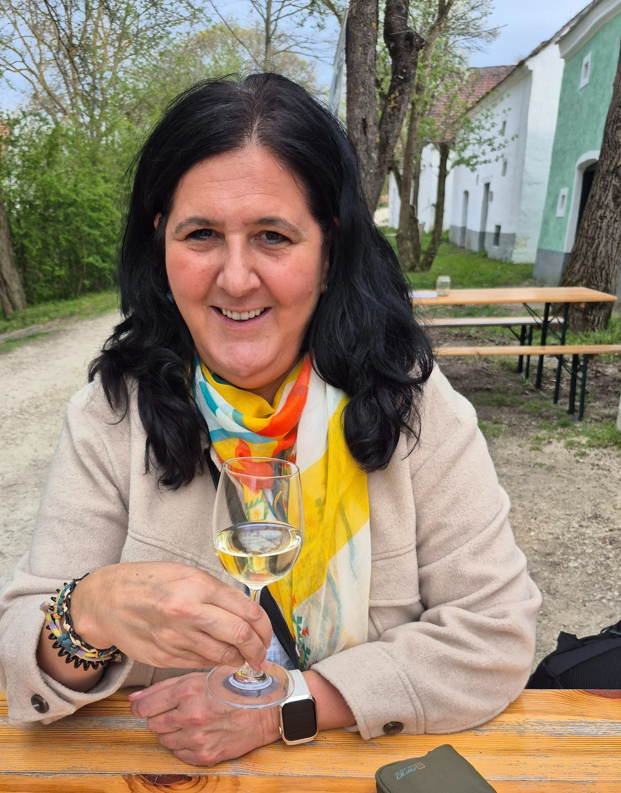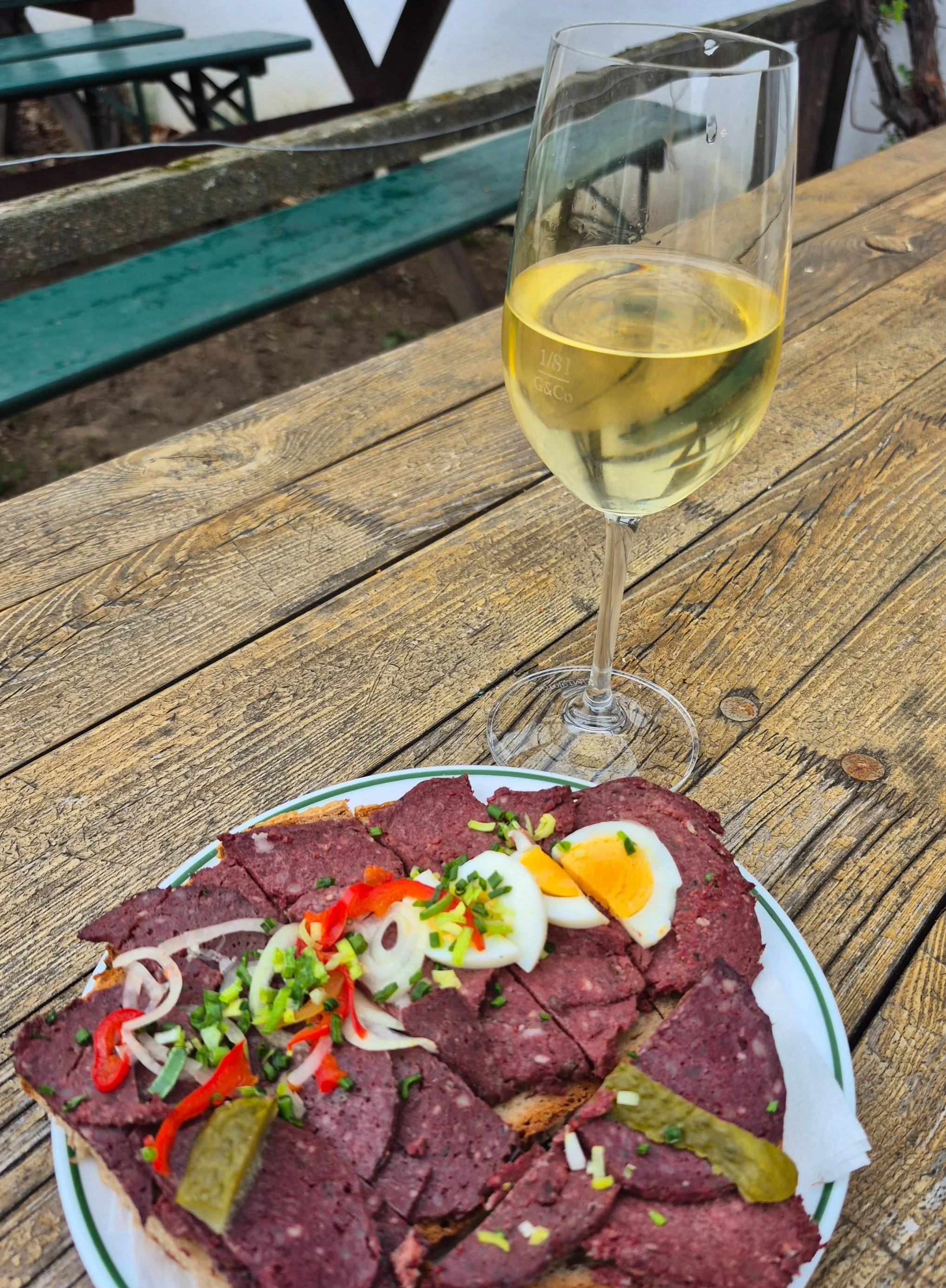 Wir probierten zwei Weine aus und gönnten uns dazu ein deftoges „Blunznbrot“ – Genuss pur.