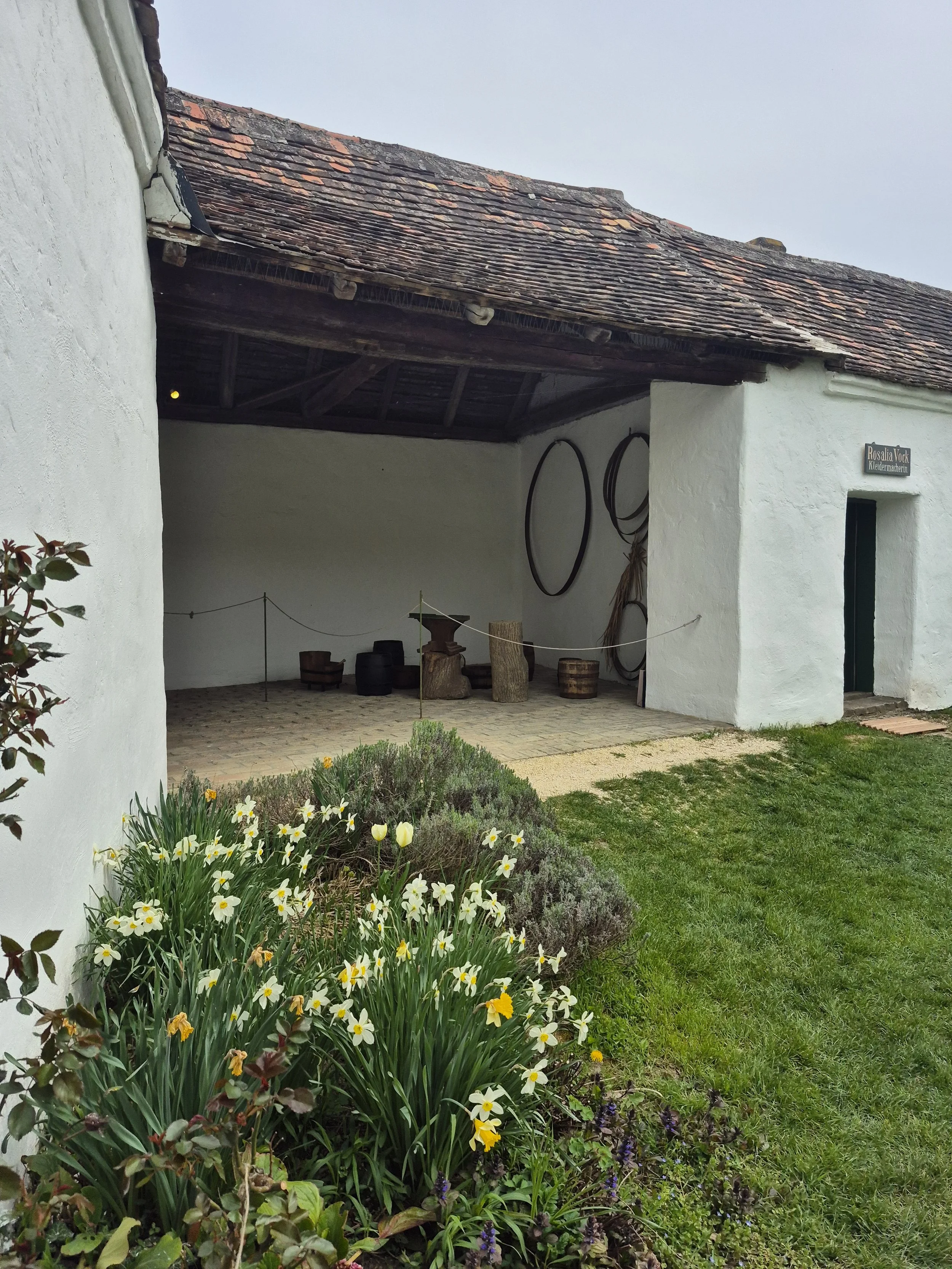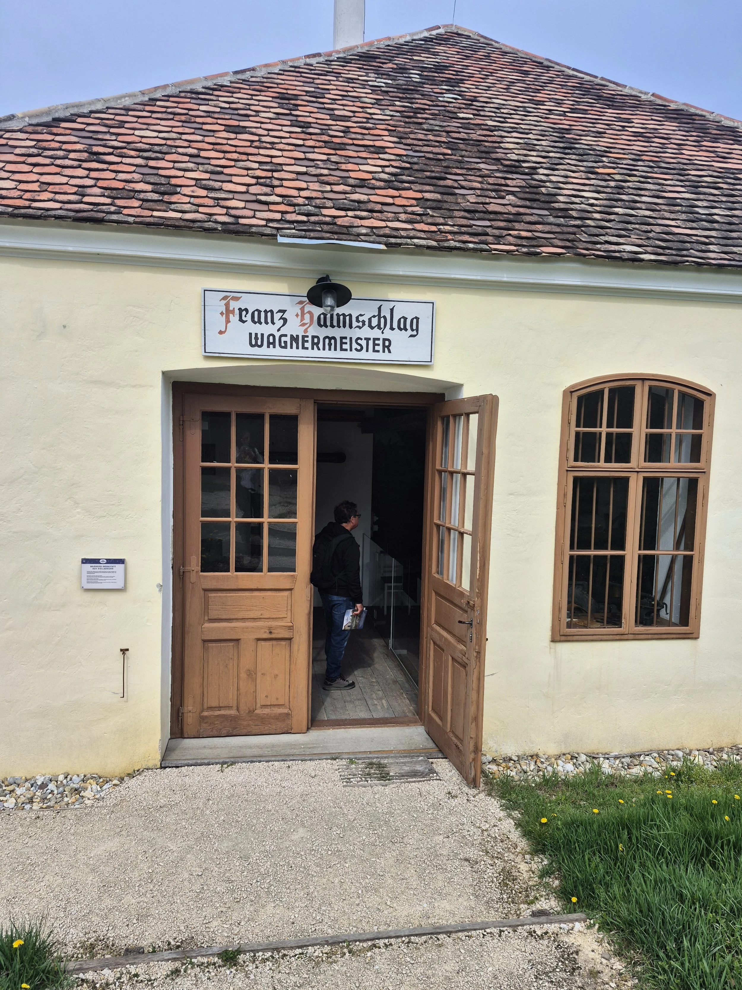 Wenn man den Weg weiter entlang geht, kommt man zum Hof des Wagners. In einem Gebäude ist die Werkstatt untergebracht, wo man Originalwerkzeuge und eine Werkbank, die schon viel erlebt hat, begutachten kann.