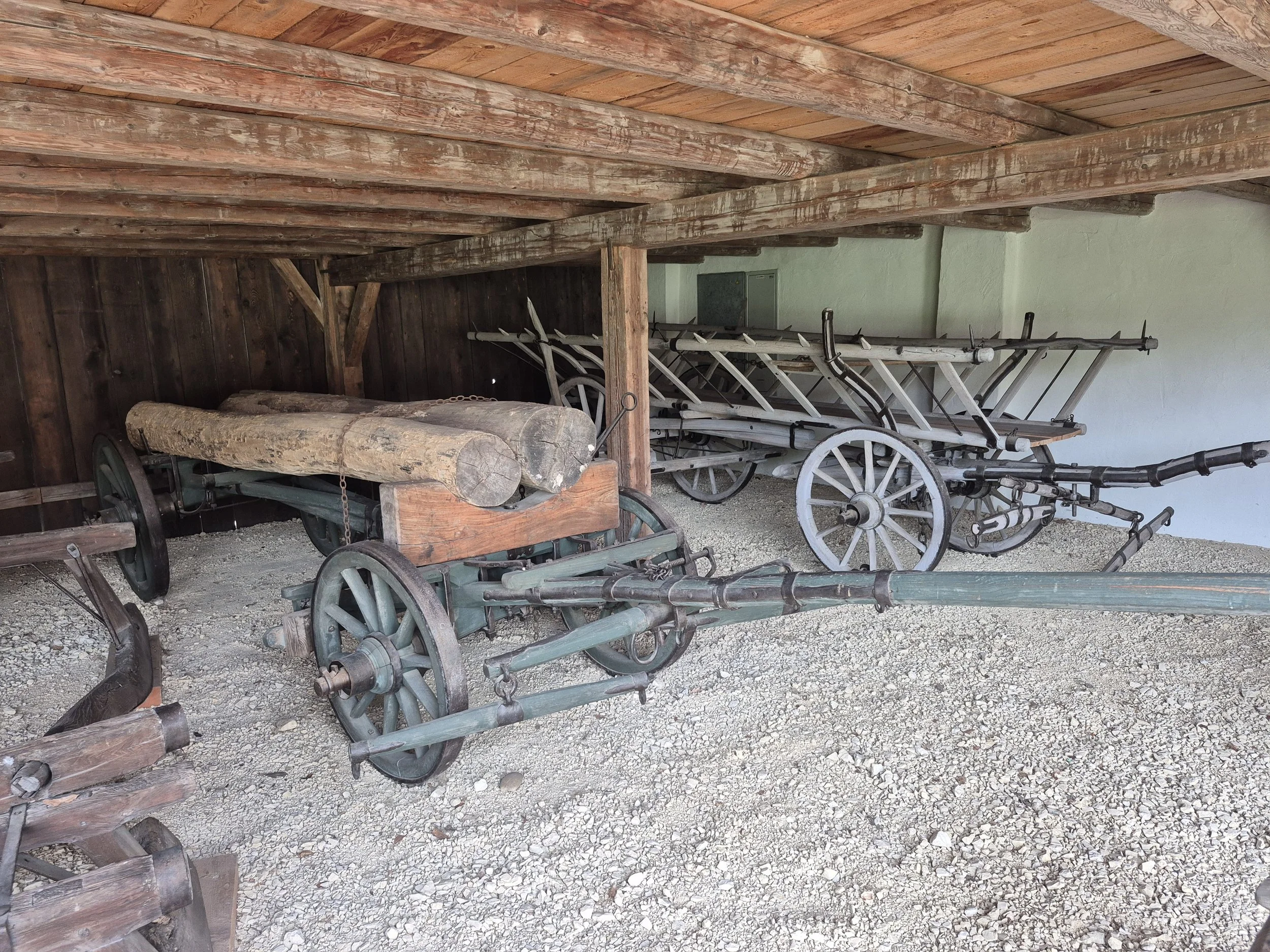 In einem Stadl sieht man verschiedene landwirtschaftliche Nutzfahrzeuge aus der Zeit.