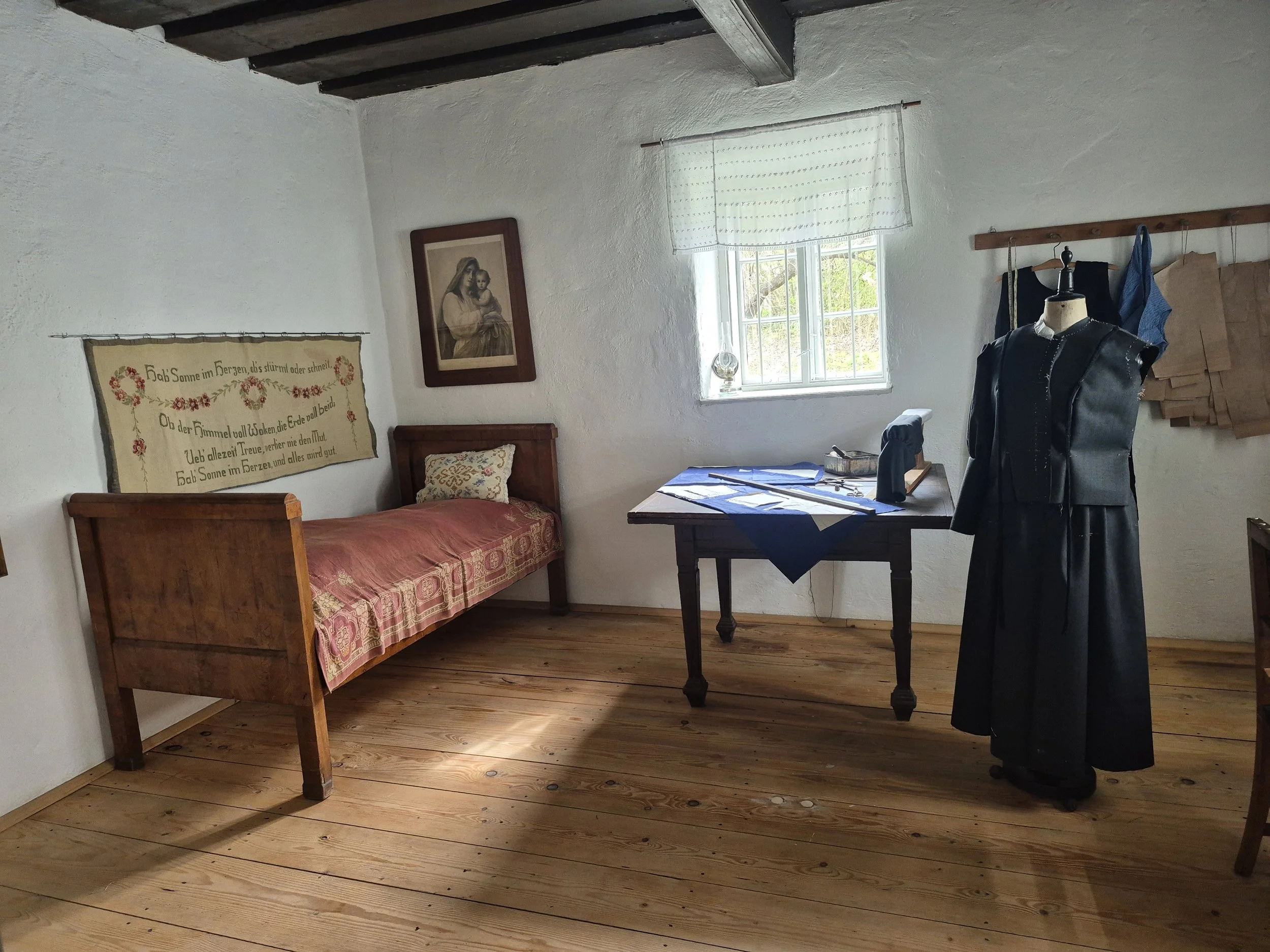 Wir sahen uns zuerst den großen Vierkanthof an, der links von uns lag. Dort findet man die Wohnung der Schneiderin, die gleichzeitig als Atelier diente.