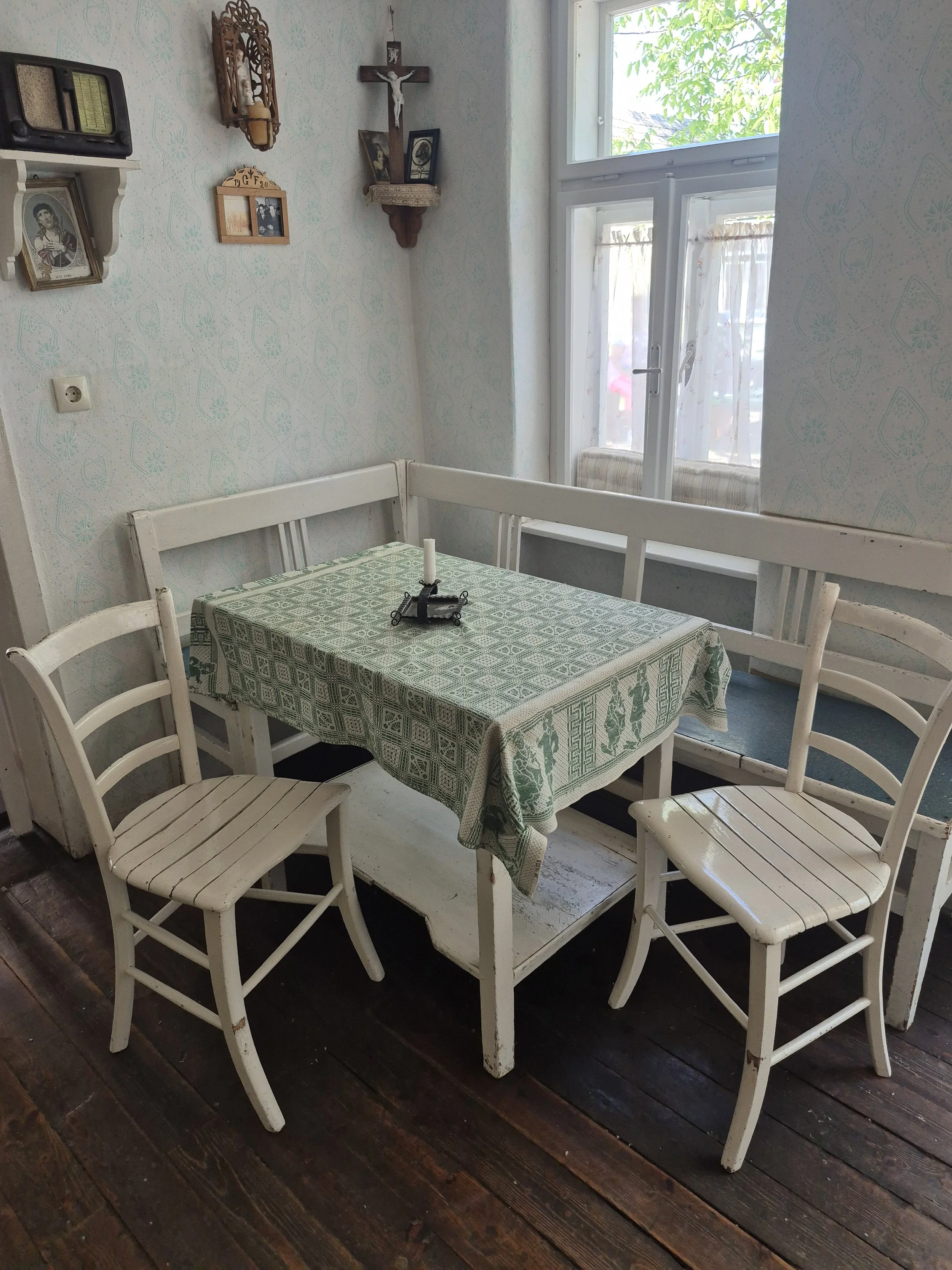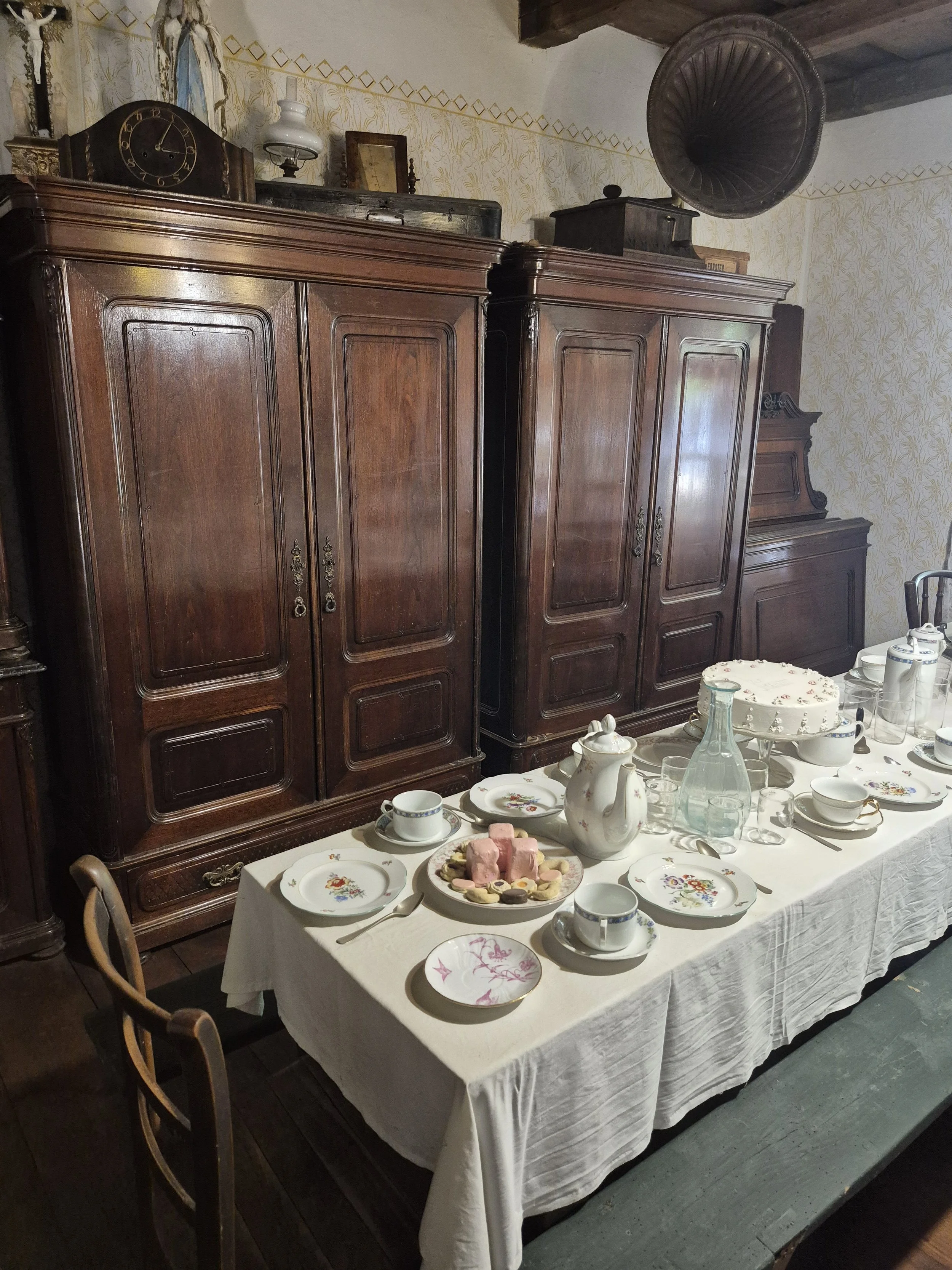 Auch die Kücheneinrichtung, vor allem die Kredenz mit den darin enthaltenen Geschirrwaren mir aus der Kindheit vertraut.