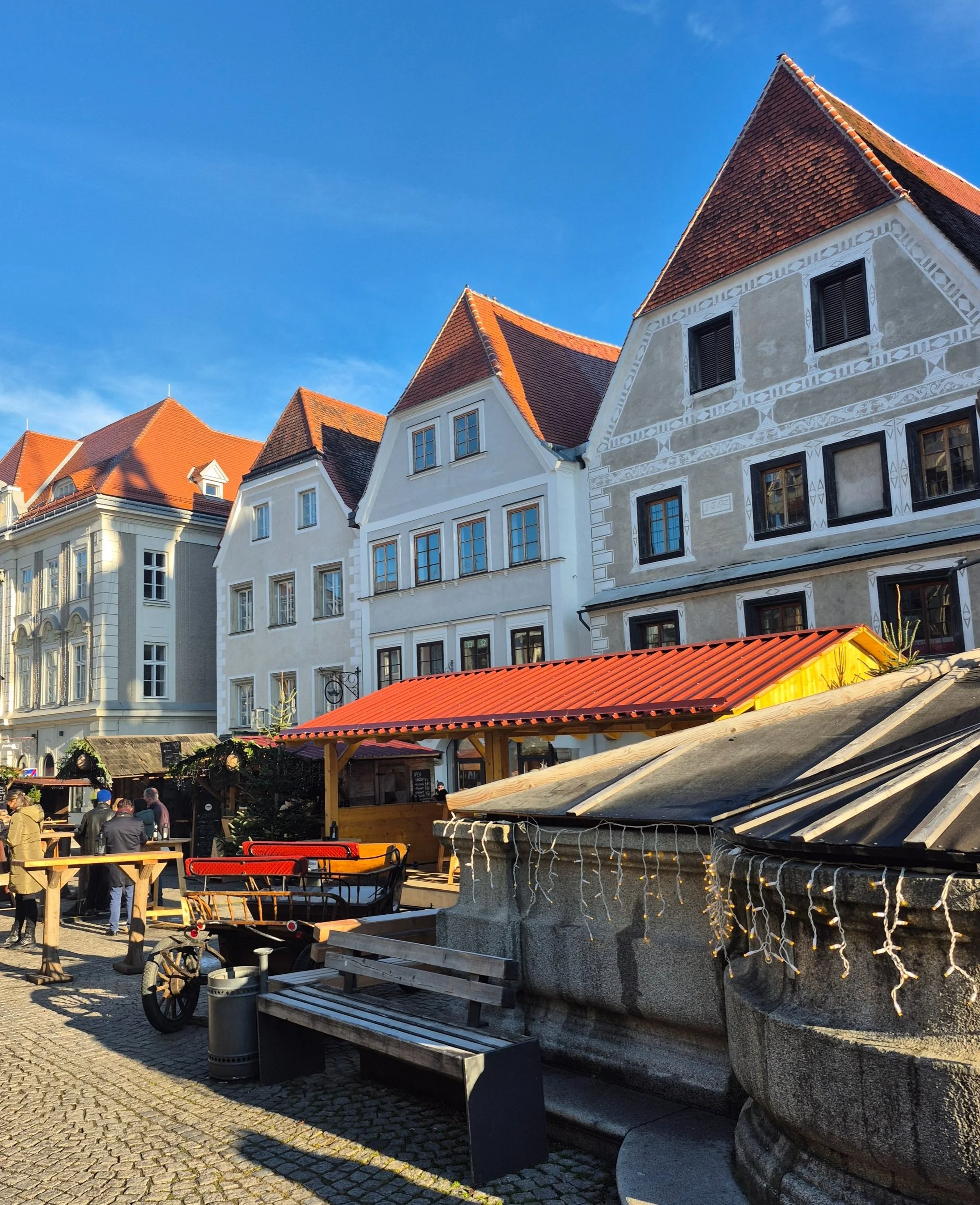 Auf dem Stadtplatz waren überraschenderweise noch einige Stände des Weihnachtsmarkts geöffnet, obwohl Weihnachten schon vorüber war.