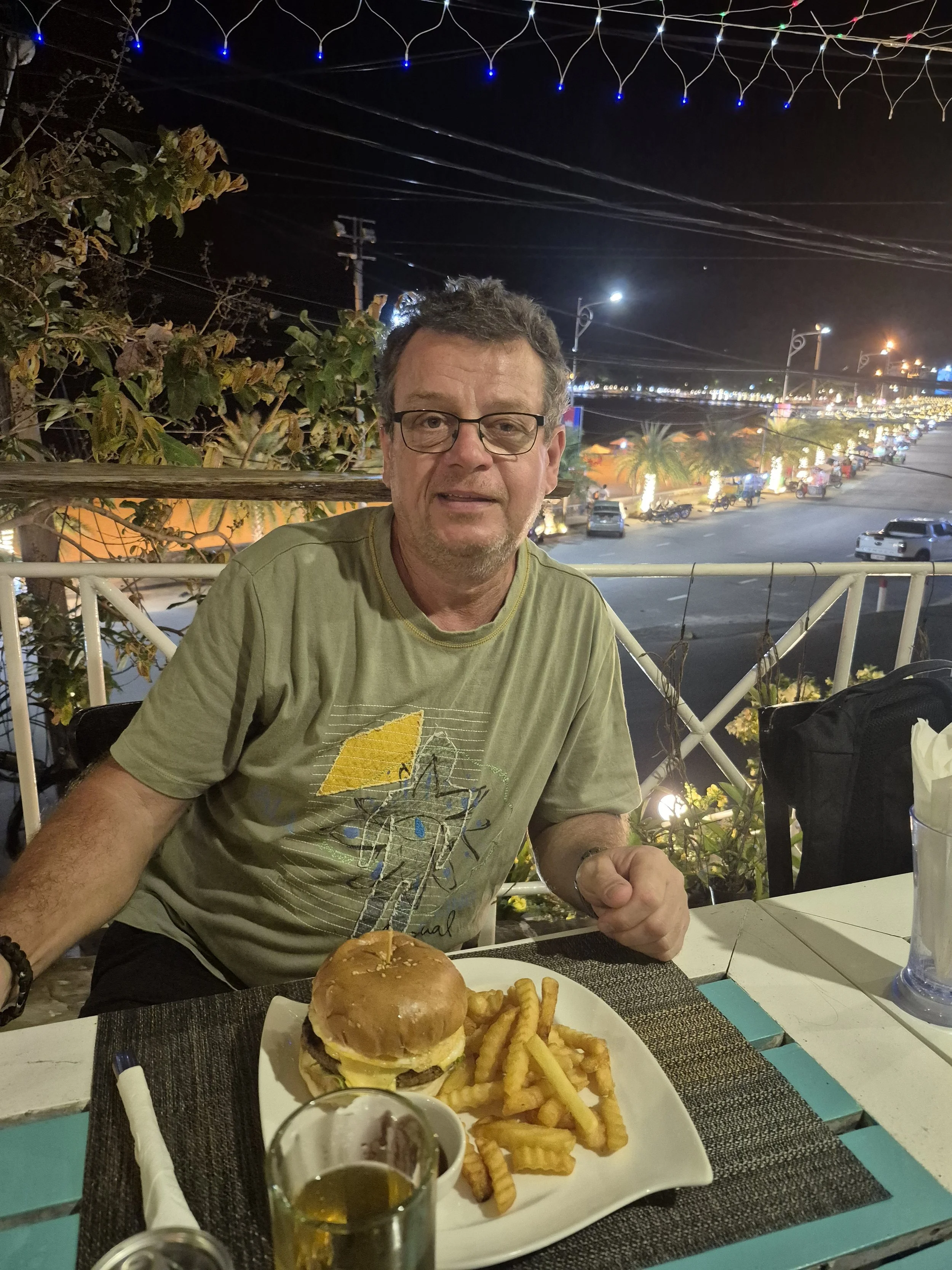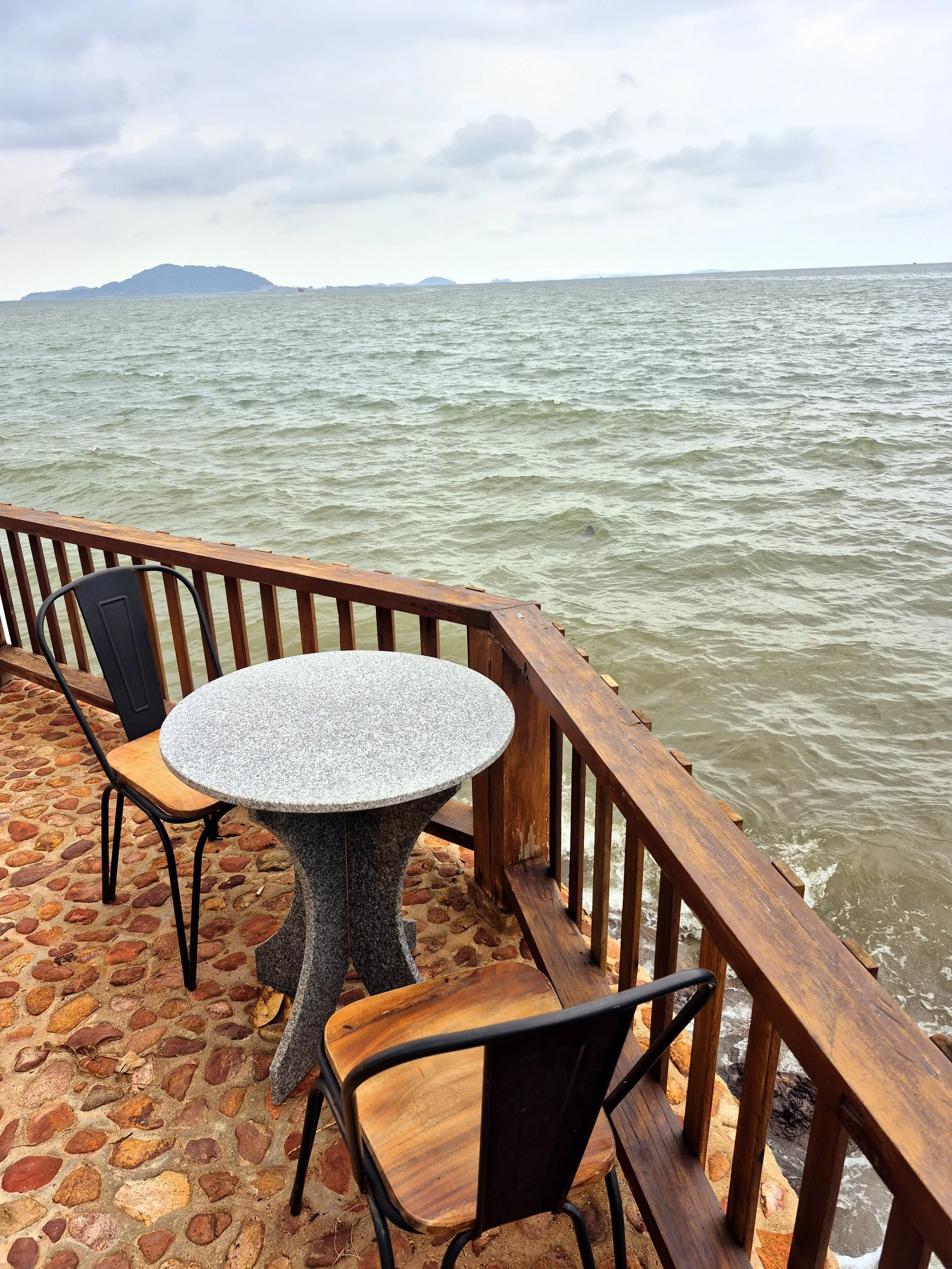 Wir schlenderten die schöne Promenade von Kep entlang, bis wir zu einem sehr idyllisch direkt am Meer gelegenen Restaurant kamen, wo wir Kaffee und frisch gepresste Säfte bestellten.