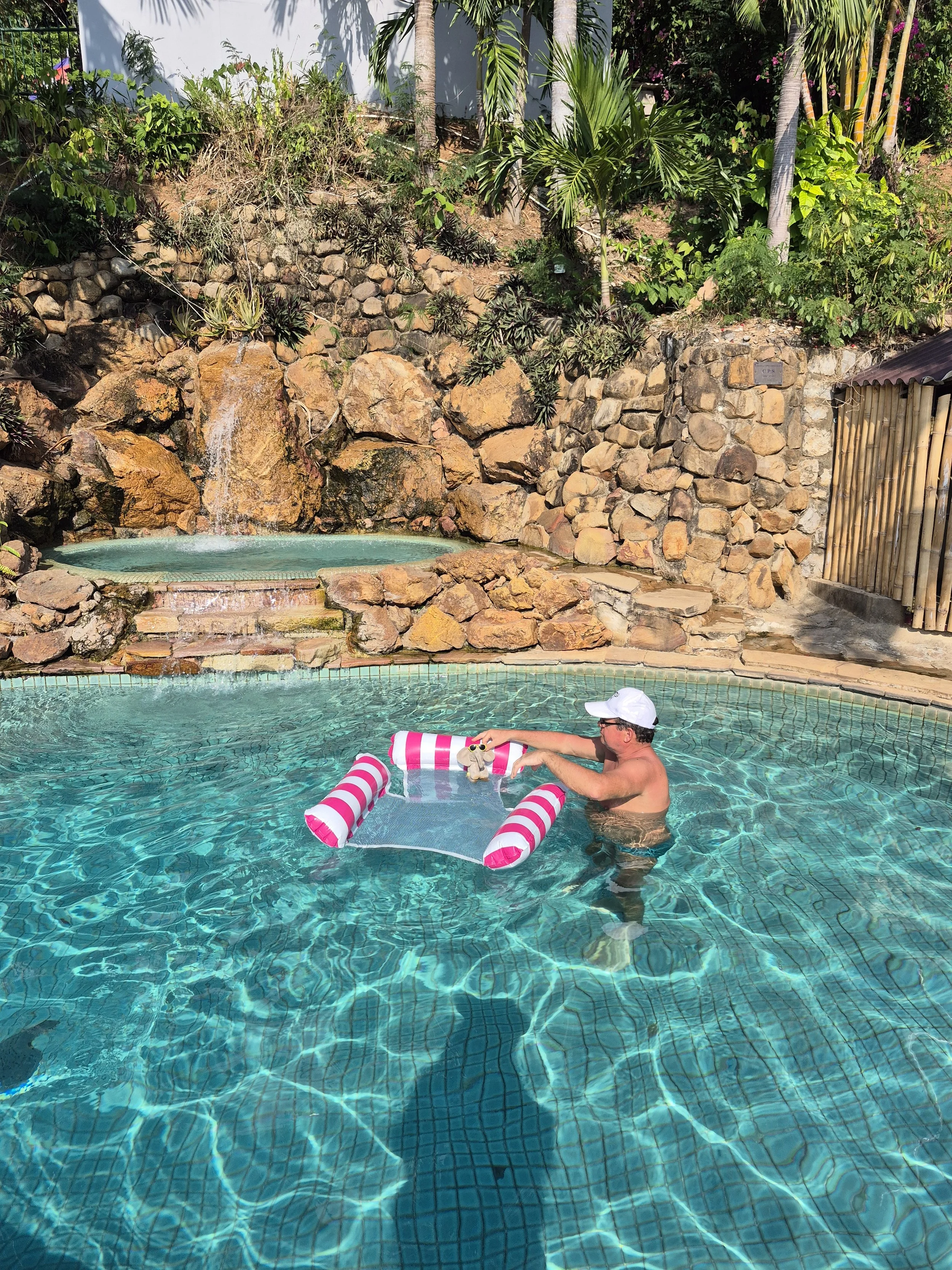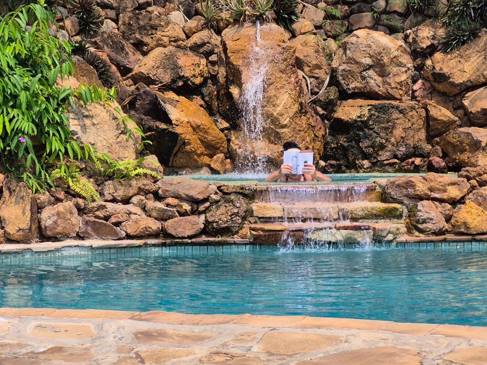 Der große Hauptpool befand sich auf der unteren Etage, darüber befand sich ein kleines Becken mit einem Wasserfall, das mit Sitzbänken ausgestattet war. Dort sollte ich viel Zeit lesend verbringen.
