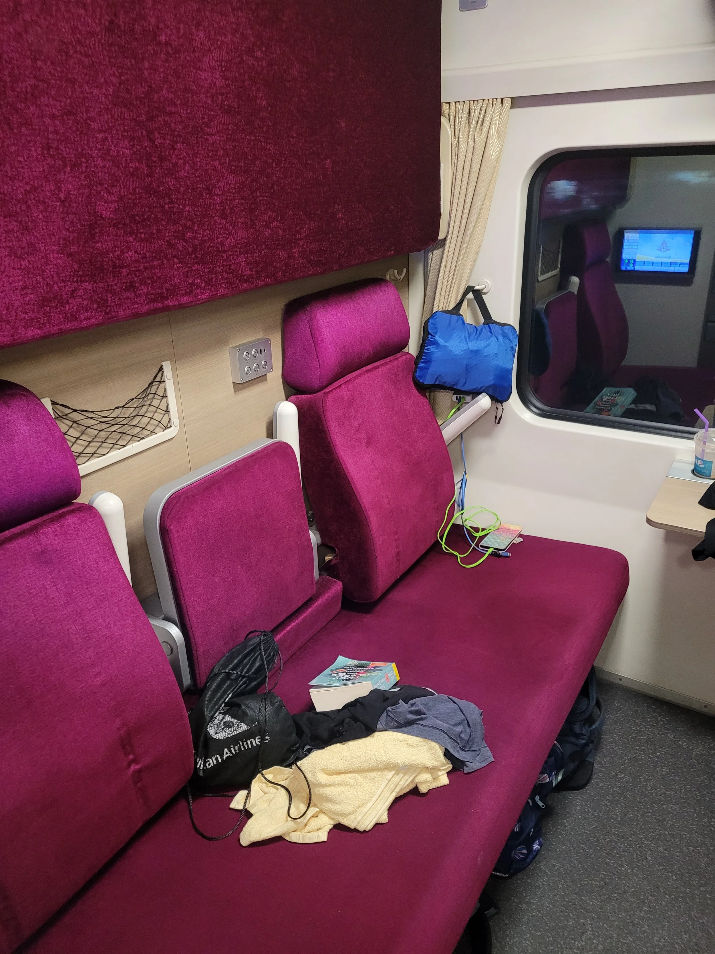 Our compartment was surprisingly comfortable. It was small, as train cabins usually are, but in addition to the seating bench that could be converted into a bed—another bed could be folded down from above—we had enough space to stow our luggage. At the end of the carriage, there were several very clean toilets and even a modern shower.