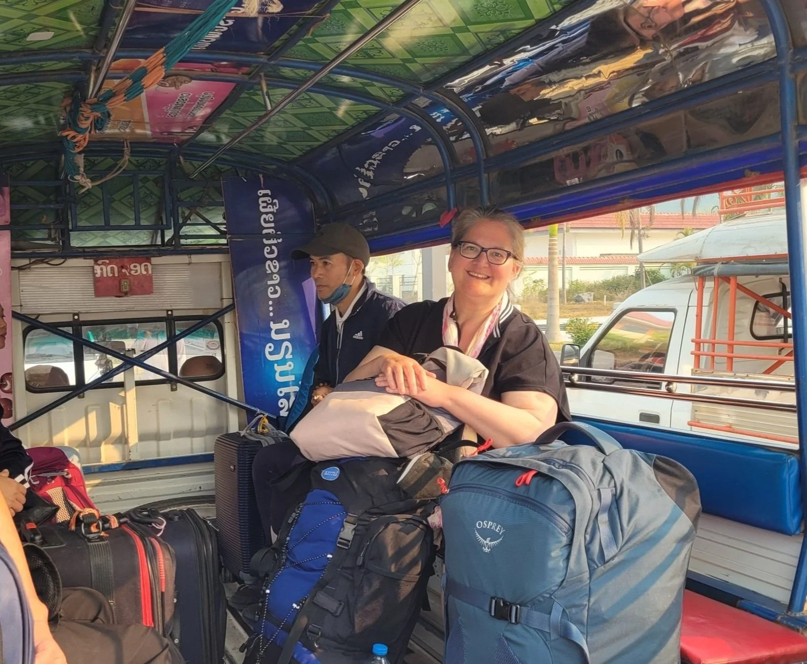 At the station in Vang Vieng, tuk-tuks were already waiting to take passengers to their accommodations.