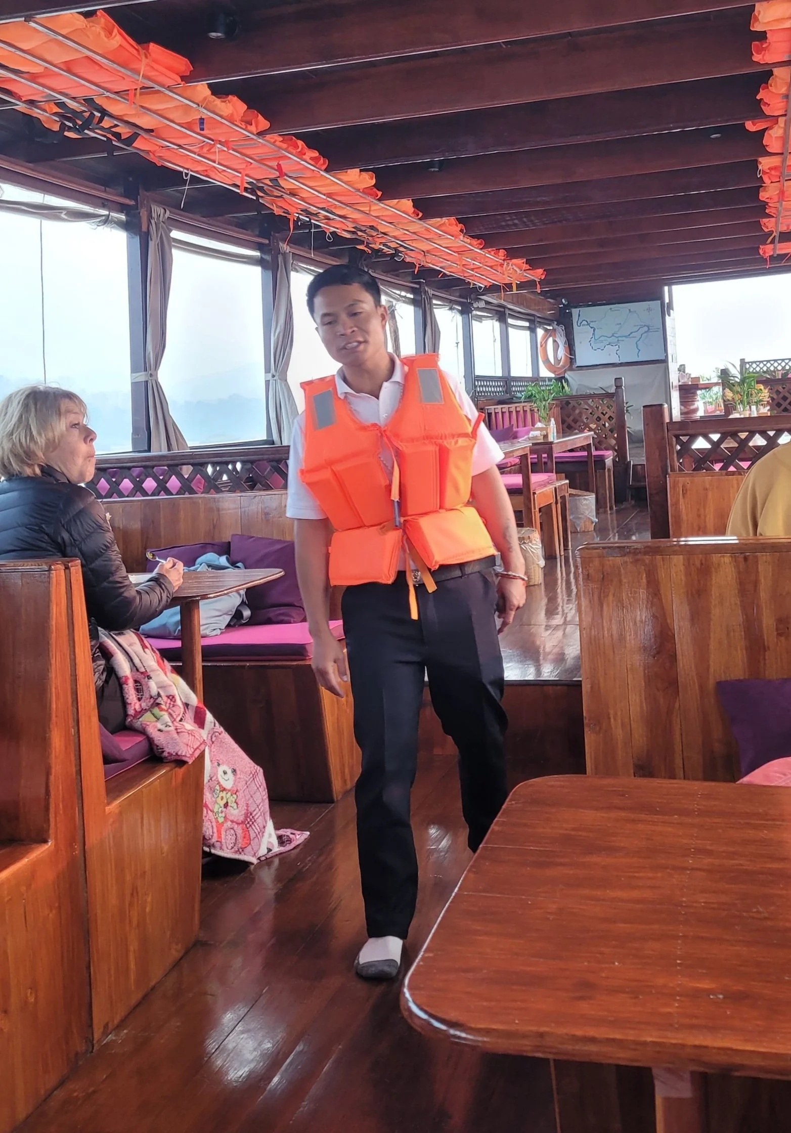 Unser Boot war ein wunderschön restauriertes Langboot, das allen erdenklichen Komfort bot. Es gab Tische mit bequemen Bänken, an denen gegessen werden konnte, im hinteren und vorderen Bereich hatten wir die Möglichkeit, es uns auf Bänken bequem zu machen.