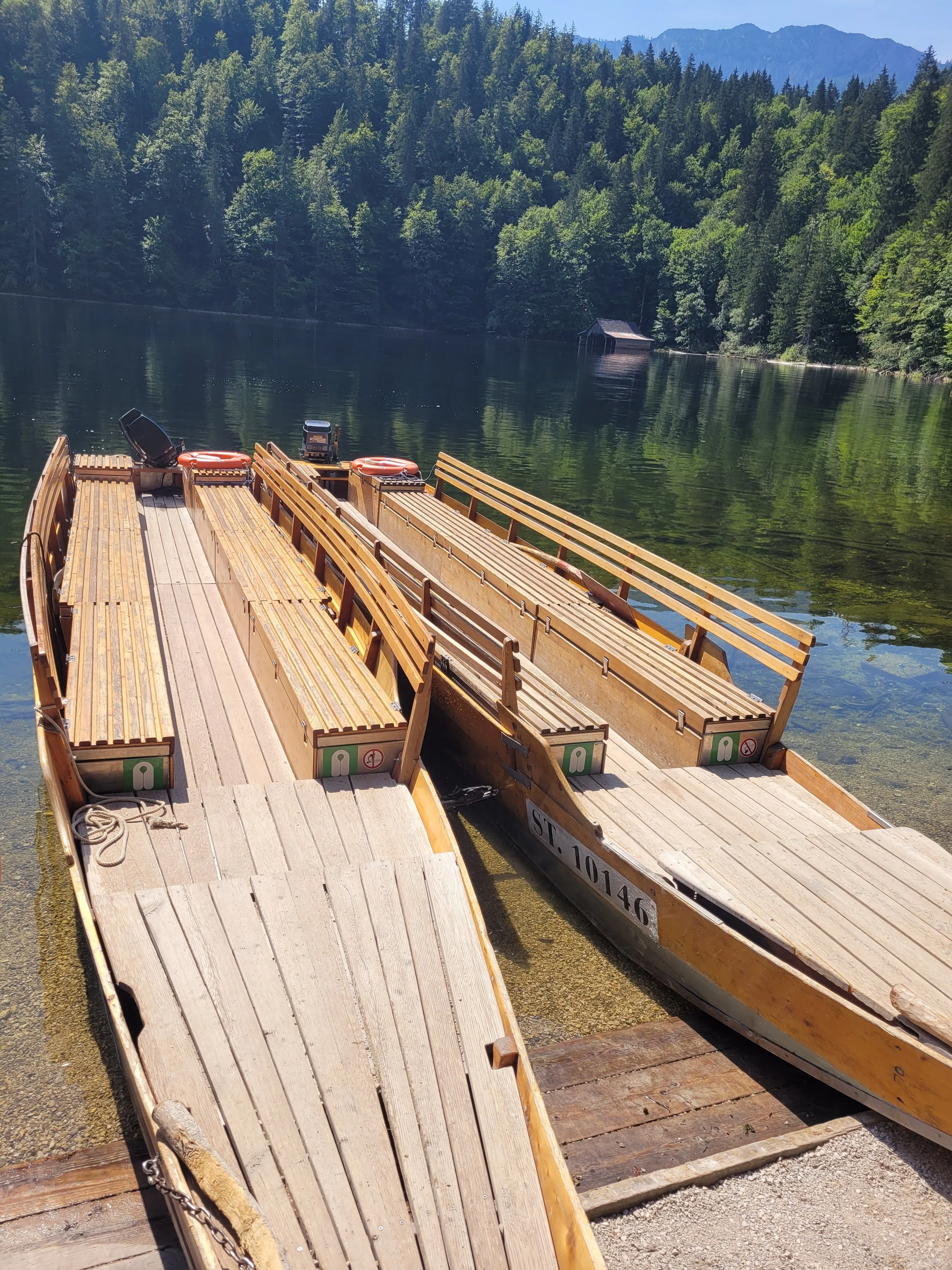 An der Bootsanlegestelle schaukeln die berühmten Holzboote im Wasser, die die Besucher über den See bringen.