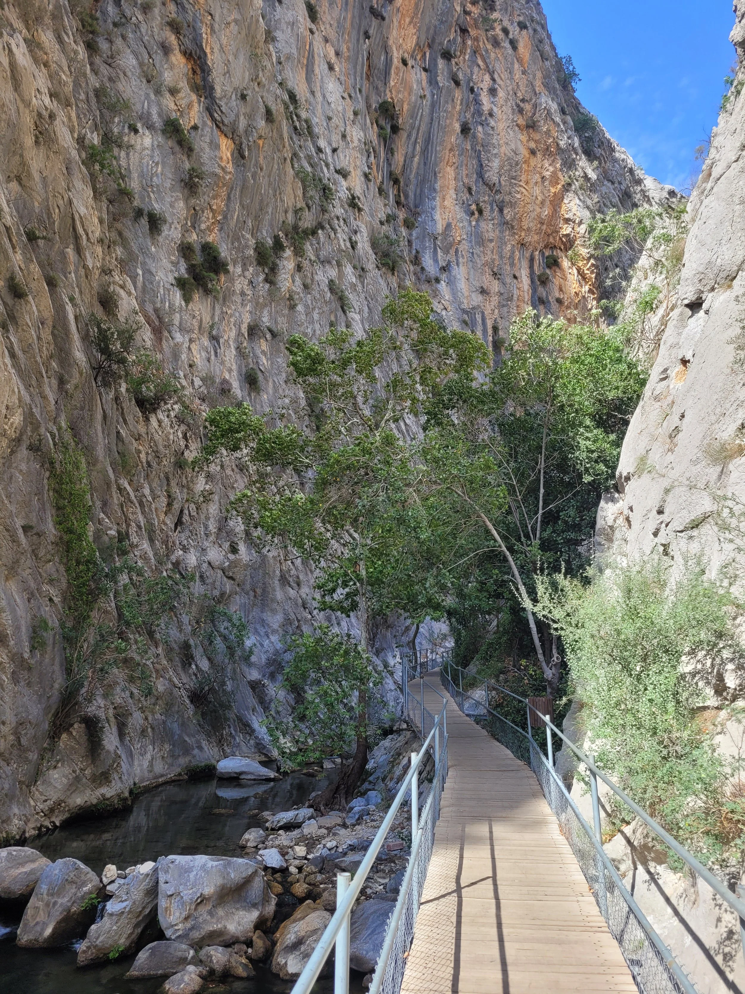 Ein schmaler Holzsteg führt vorbei an steil abfallenden Felswänden und rauschenden Wasserfällen.