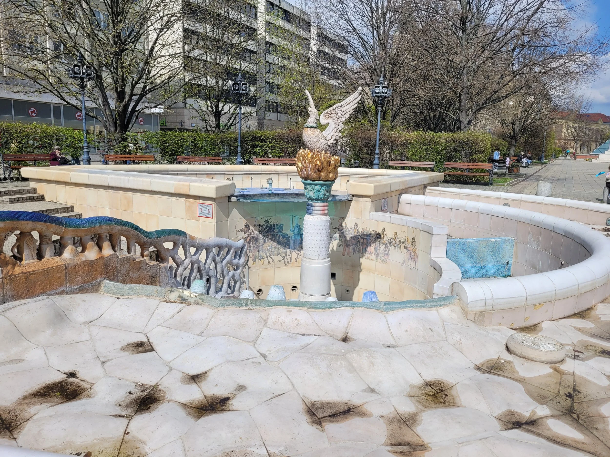 Am nahe gelegenen Kossuth Ter findet man auch einen Brunnen, der von Sitzbänken umgeben ist – der ideale Ort für eine kurze Rast.