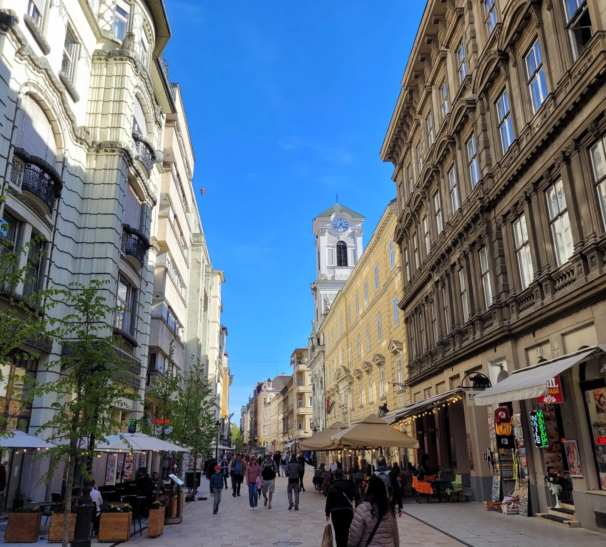 Anschließend spazierten wir durch die Váci utca bis zum Fövám tér, wo die Cafés stets von unzähligen Touristen bevölkert werden.