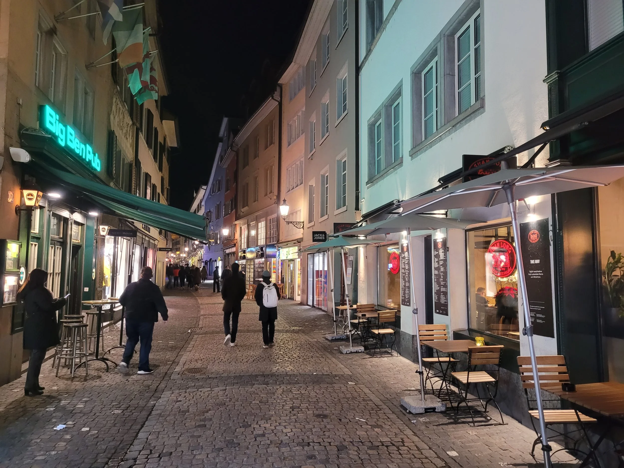 Nach dem Essen erkundeten wir noch kurz das ins warme Licht der Straßenlaternen getauchte Zürich.
