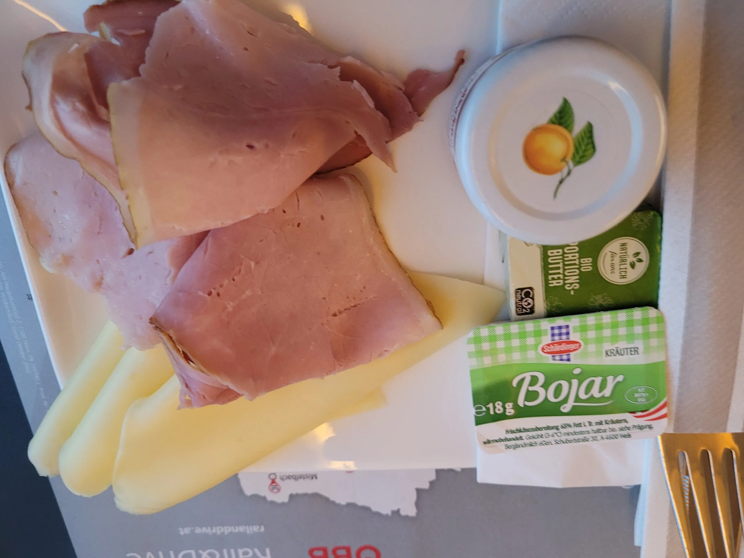 Zuerst suchten wir den Speisewagen auf. Es gibt nichts Schöneres als eine wunderbare Mahlzeit zu genießen, während die winterliche Landschaft an einem vorbeizieht. Das Frühstück im Zug schmeckte sehr viel besser als sein Ruf es vermuten ließe. Es gab ofenwarmes Gebäck, Schinken, Käse, Butter, Marmelade und natürlich Kaffee.